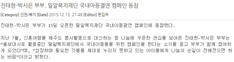 [아크로팬] 진태현-박시은 부부, 밀알복지재단 국내아동결연 캠페인 동참