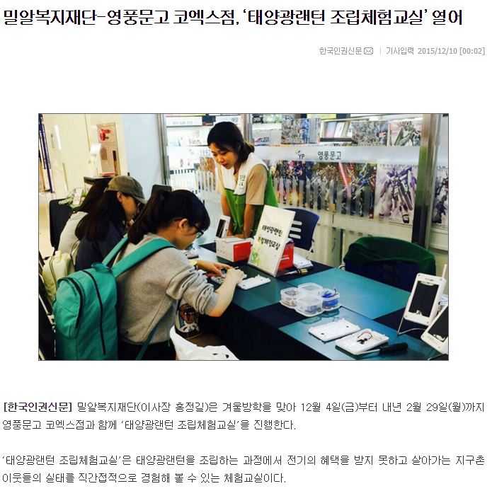 [한국인권신문] 밀알복지재단-영풍문고 코엑스점, ‘태양광랜턴 조립체험교실’ 열어