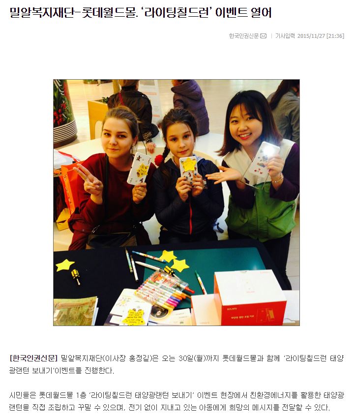 [한국인권신문] 밀알복지재단-롯데월드몰. ‘라이팅칠드런’ 이벤트 열어