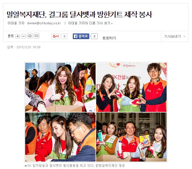 [크리스천투데이] 밀알복지재단, 걸그룹 달샤벳과 방한키트 제작 봉사