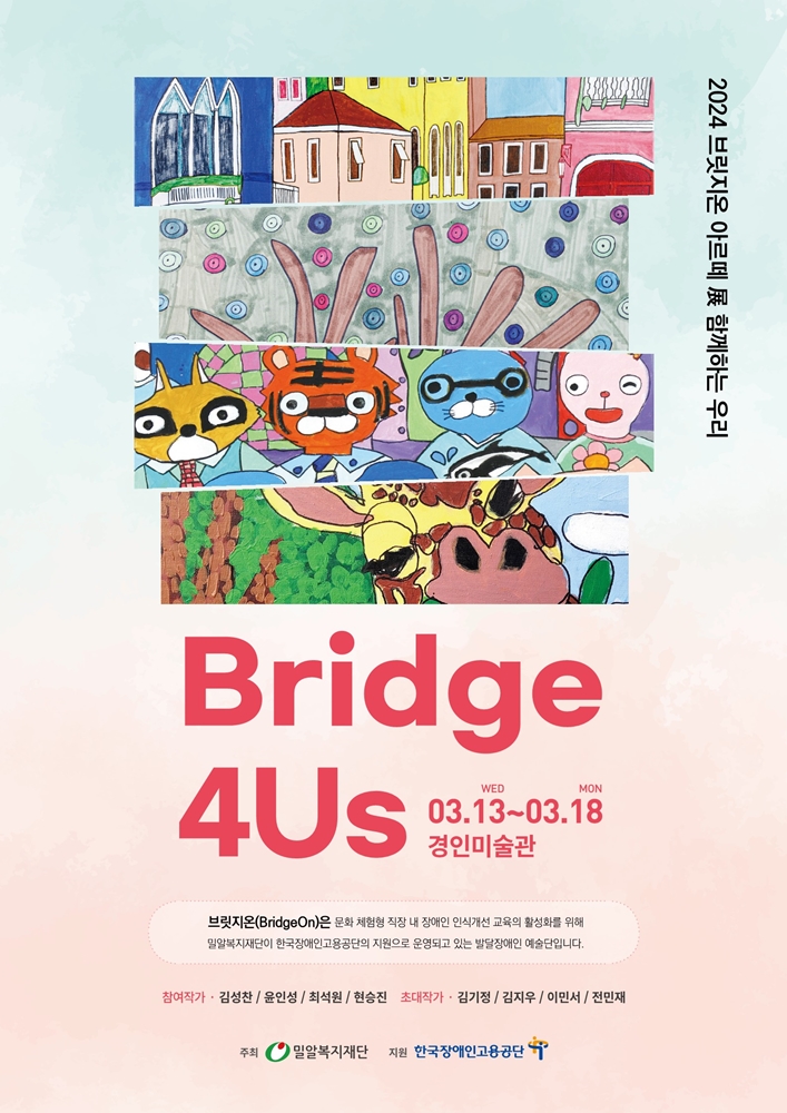 밀알복지재단(이사장 홍정길) 소속 ‘브릿지온 아르떼’가 3월 13일부터 18일까지 서울 종로구 경인미술관에서 ‘Bridge 4Us(브릿지 포 어스) - 함께하는 우리’ 전시회를 개최한다.