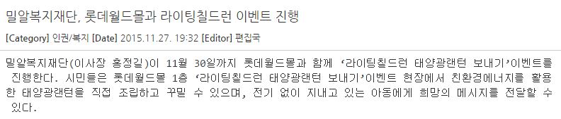 [아크로팬] 밀알복지재단, 롯데월드몰과 라이팅칠드런 이벤트 진행