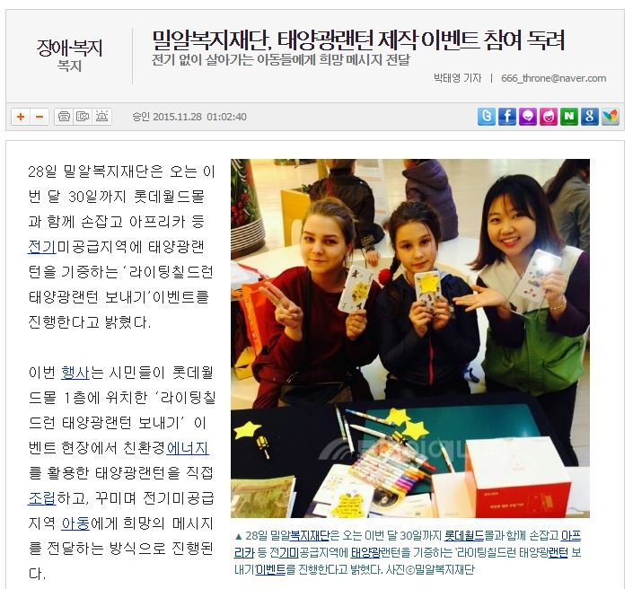 [시사포커스] 밀알복지재단, 태양광랜턴 제작 이벤트 참여 독려