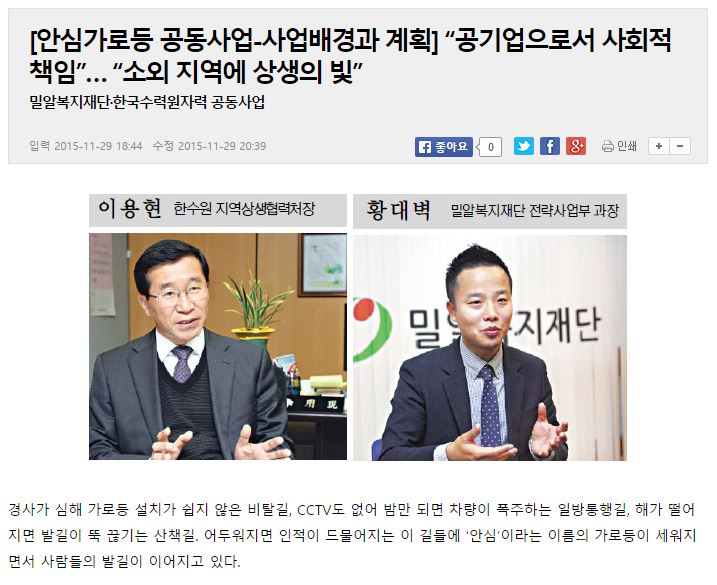 [국민일보] 밀알복지재단·한수원 안심가로등 공동사업 “공기업으로서 사회적 책임”… “소외 지역에 상생의 빛”