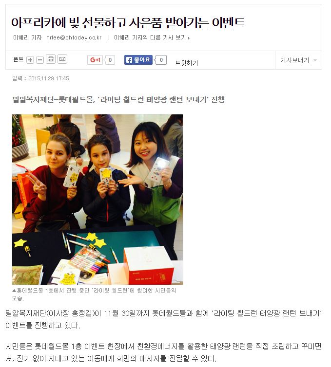 [크리스천투데이] 아프리카에 빛 선물하고 사은품 받아가는 이벤트