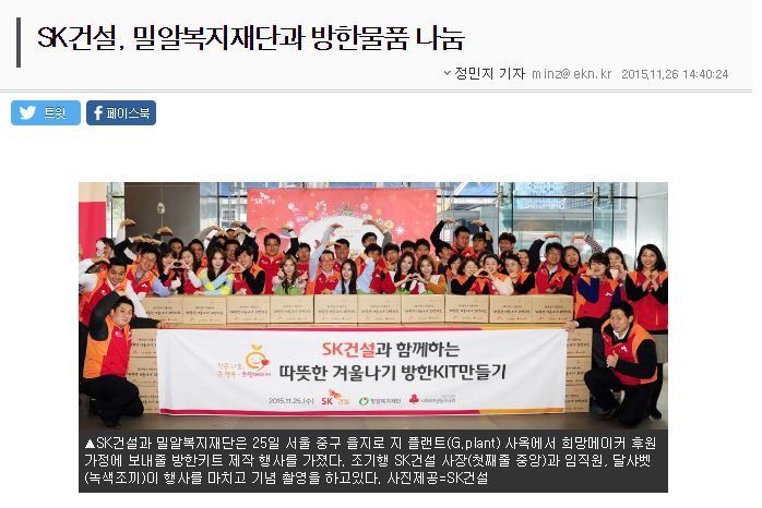 [미디어펜] SK건설, 저소득층 방한키트 전달…달샤벳, "따뜻한 겨울 나세요"