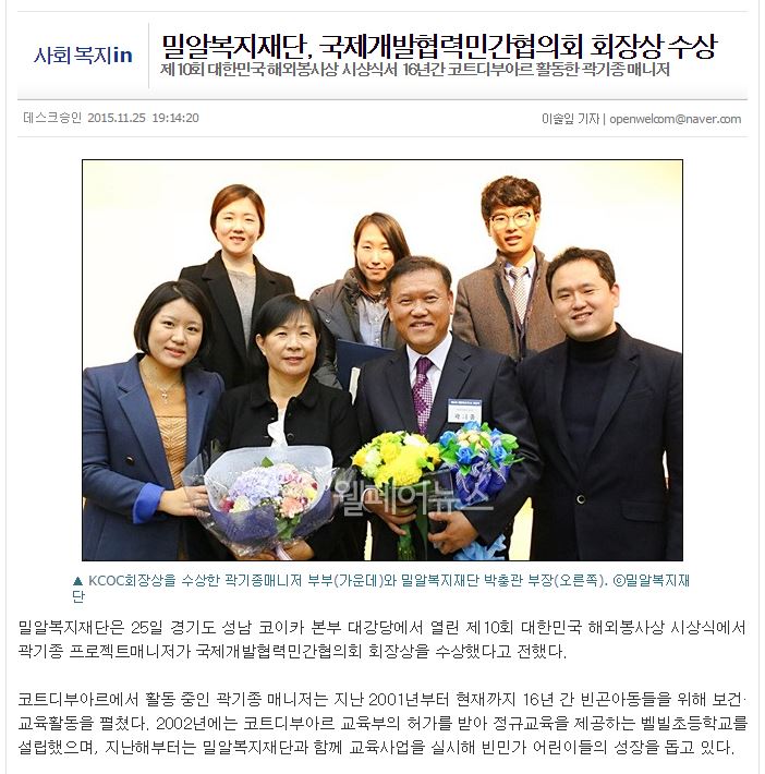 [웰페어뉴스] 밀알복지재단, 국제개발협력민간협의회 회장상 수상