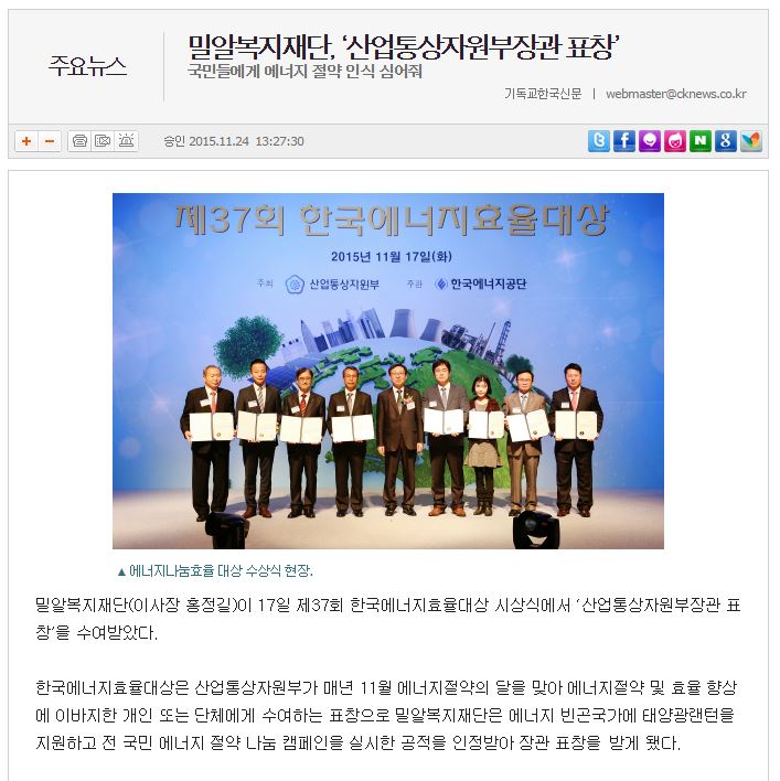 [기독교한국신문] 밀알복지재단, ‘산업통상자원부장관 표창’