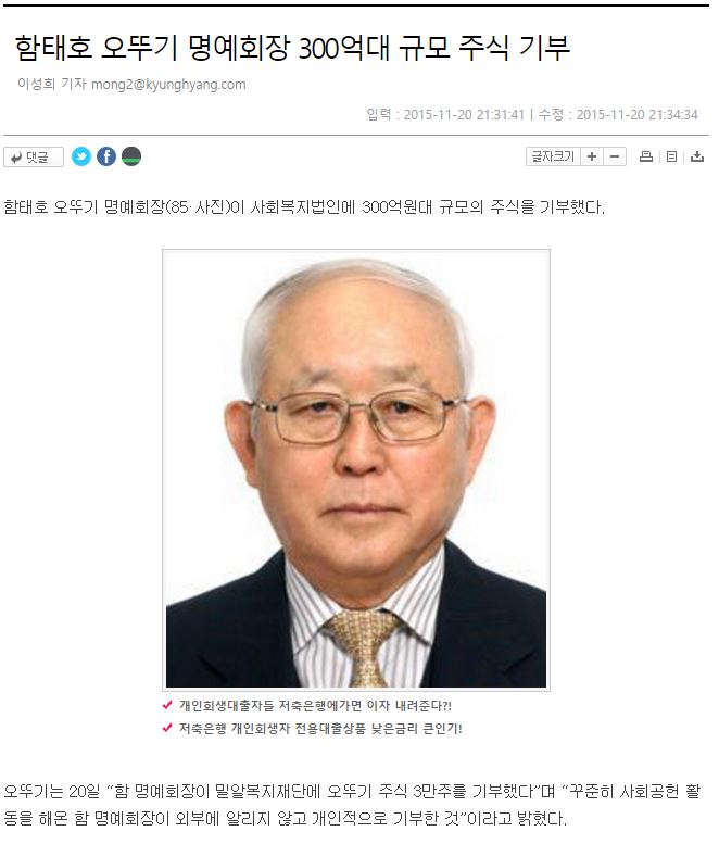 [경향신문] 함태호 오뚜기 명예회장 300억대 규모 주식 기부