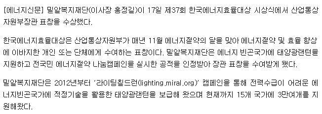 [에너지신문] 밀알복지재단, 에너지효율대상 장관 표창 수상