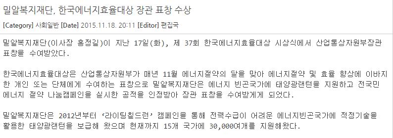 [아크로팬] 밀알복지재단, 한국에너지효율대상 장관 표창 수상