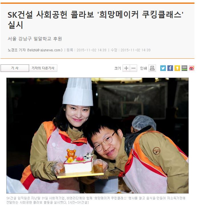 [아주경제] SK건설 사회공헌 콜라보 '희망메이커 쿠킹클래스' 실시