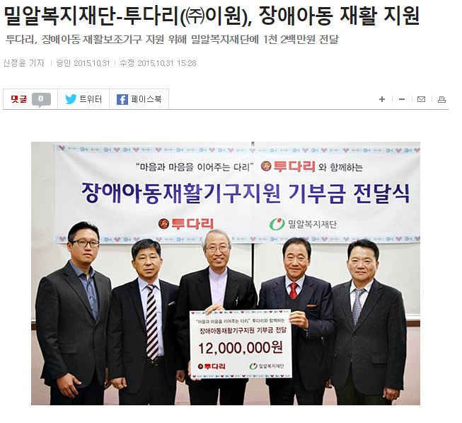 [한국인권신문] 투다리, 장애아동 위해 밀알복지재단에 1200만원 기부