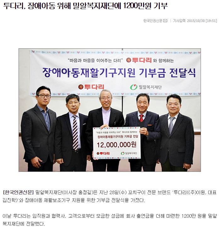 [한국인권신문] 투다리, 장애아동 위해 밀알복지재단에 1200만원 기부
