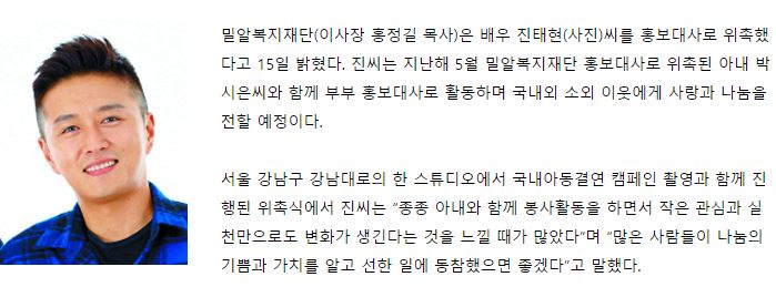 [국민일보] 배우 진태현 밀알복지재단 홍보대사