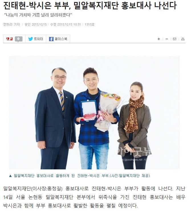 [스타저널] 진태현, 아내 박시은과 함께 밀알복지재단 홍보대사로 위촉되다