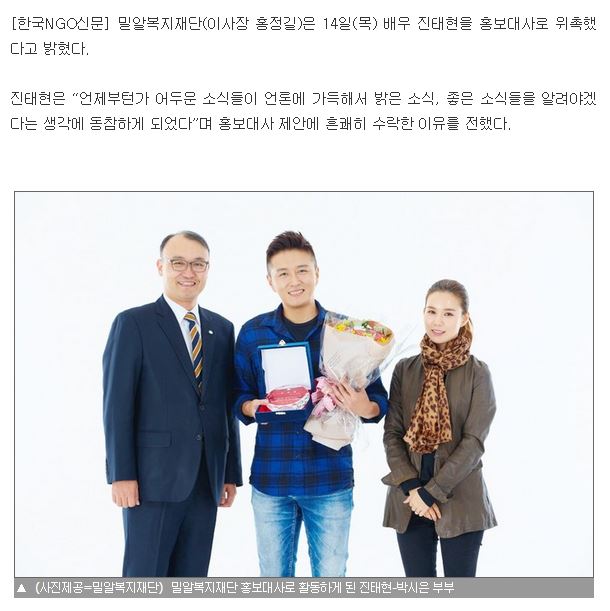 [한국NGO신문] 배우 진태현, 밀알복지재단 홍보대사 위촉