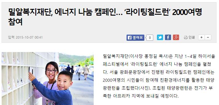 [국민일보] 밀알복지재단, 에너지 나눔 캠페인… ‘라이팅칠드런’ 2000여명 참여