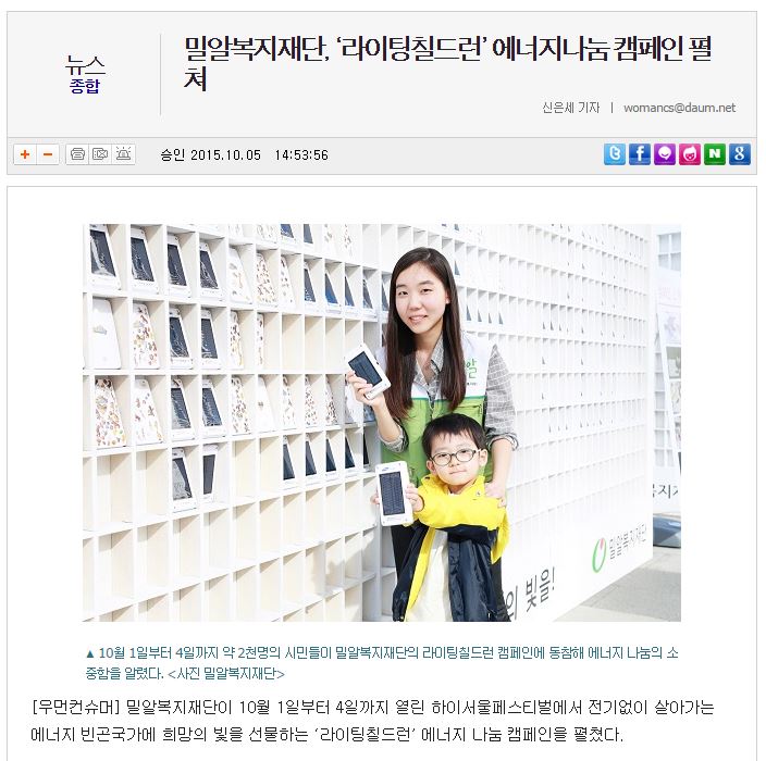 [우먼컨슈머] 밀알복지재단, ‘라이팅칠드런’ 에너지나눔 캠페인 펼쳐