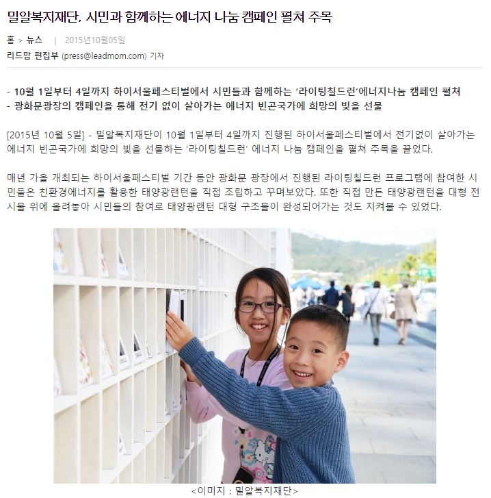 [리드맘] 밀알복지재단, 시민과 함께하는 에너지 나눔 캠페인 펼쳐 주목