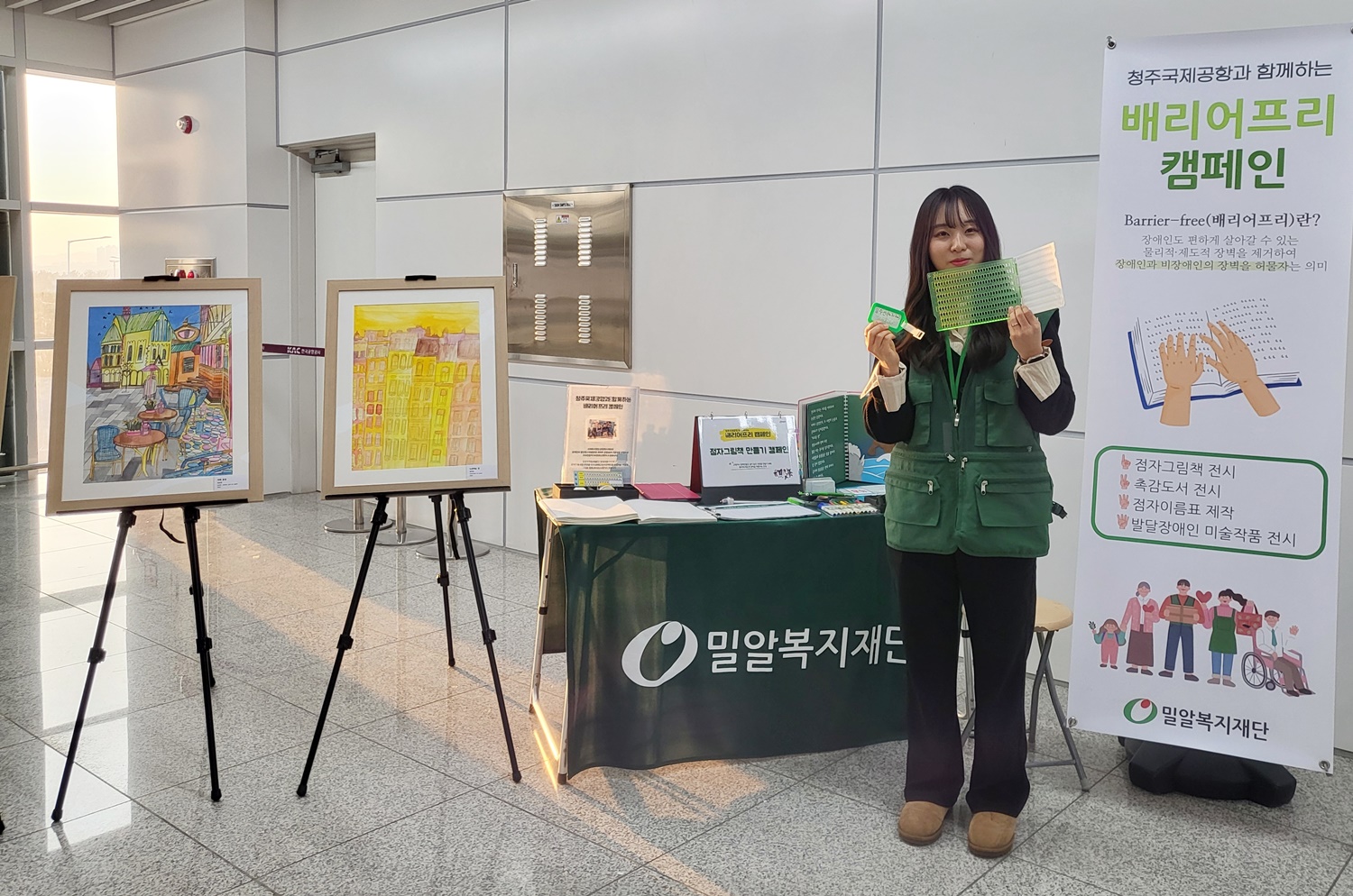 청주국제공항의 공간 기부로 진행되는 이번 캠페인은 발달장애인 작품 전시, 점자 그림책·네임택 만들기 등 다양한 체험 활동을 통해 장애에 대한 인식을 개선하고자 마련됐다.
