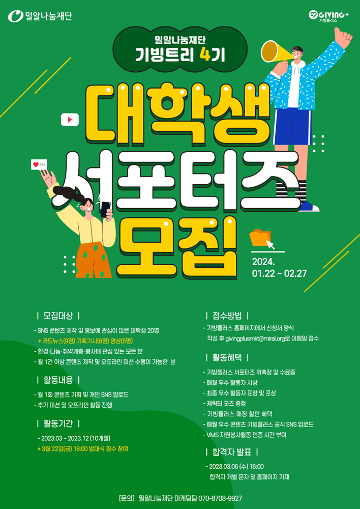 선발된 서포터즈는 3월부터 12월까지 ▲밀알나눔재단 기빙플러스 관련 콘텐츠 제작 ▲친환경, 나눔, 취약계층, 봉사 등 ESG 관련 주제로 한 차별화된 온·오프라인 미션 등 다양한 활동을 수행한다.