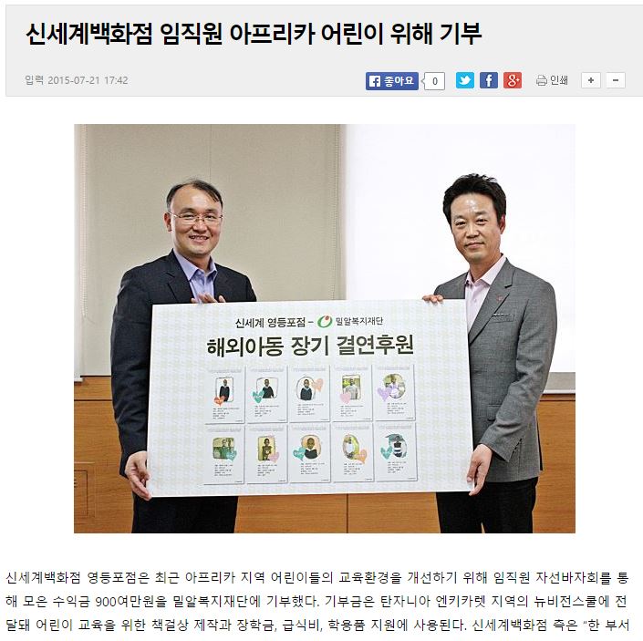 [국민일보] 신세계백화점 임직원 아프리카 어린이 위해 기부