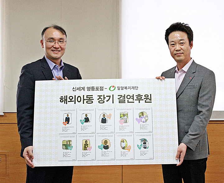 밀알복지재단 이기민 사무처장과 신세계백화점 영등포점 곽웅일 상무가 기부금 전달식을 진행하고 있다.