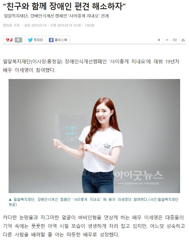 [한국인권신문] 배우 이세영, 밀알복지재단 장애인인식개선 캠페인 동참