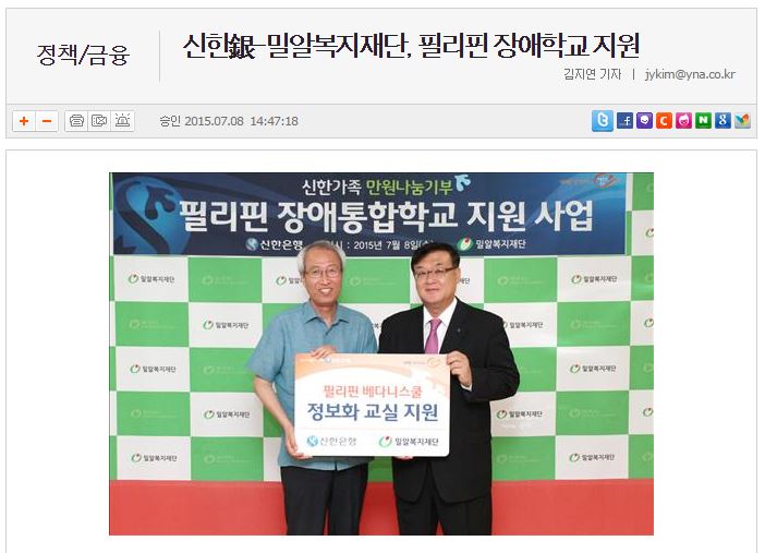 [연합인포맥스] 신한銀-밀알복지재단, 필리핀 장애학교 지원