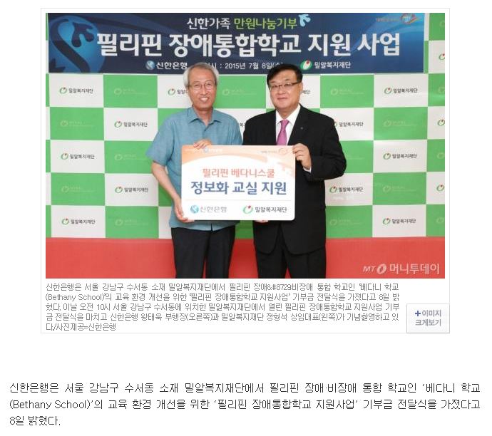 [머니투데이] 신한銀, 밀알복지재단과 필리핀 장애학생 교육환경개선