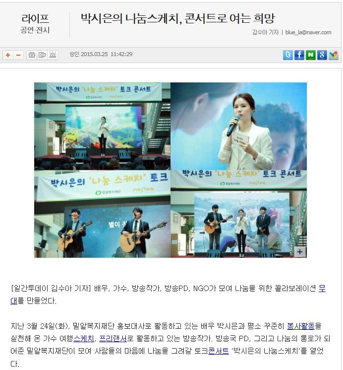 [일간투데이] 박시은의 나눔스케치, 콘서트로 여는 희망