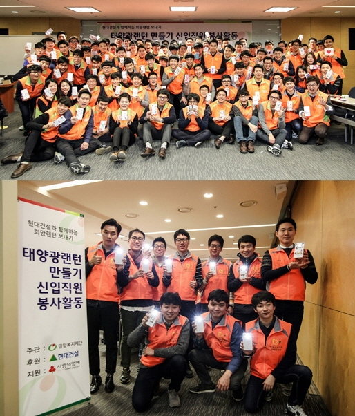 현대건설 임직원 87명은 지난 17일 종로구 계동 현대건설 사옥에서 우간다로 보낼 태양광랜턴 1,300여개를 직접 조립했으며, 우간다 어린이들이 어둠 속에서 희망을 잃지 않길 바라는 마음으로 직접 손 편지를 작성하기도 했다.