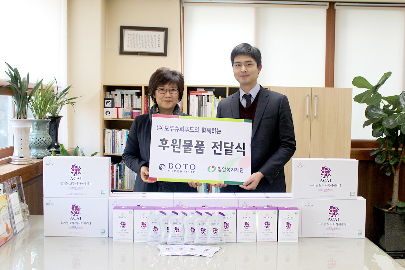 브라질 직수입 유기농 아사이베리 원액, 코코넛 오일 등을 판매하는 ㈜보뚜슈퍼푸드가 2014년 기준 125만 명을 넘긴 독거노인들의 건강을 지원하기 위해 건강보조식품을 기부했다.