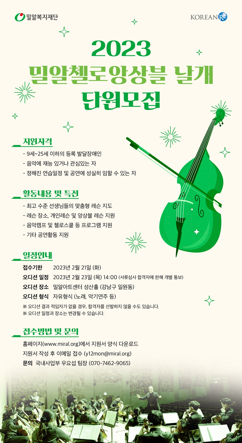 [포스터] 밀알복지재단이 밀알첼로앙상블 날개에서 활동할 발달장애인 첼리스트를 모집한다.
