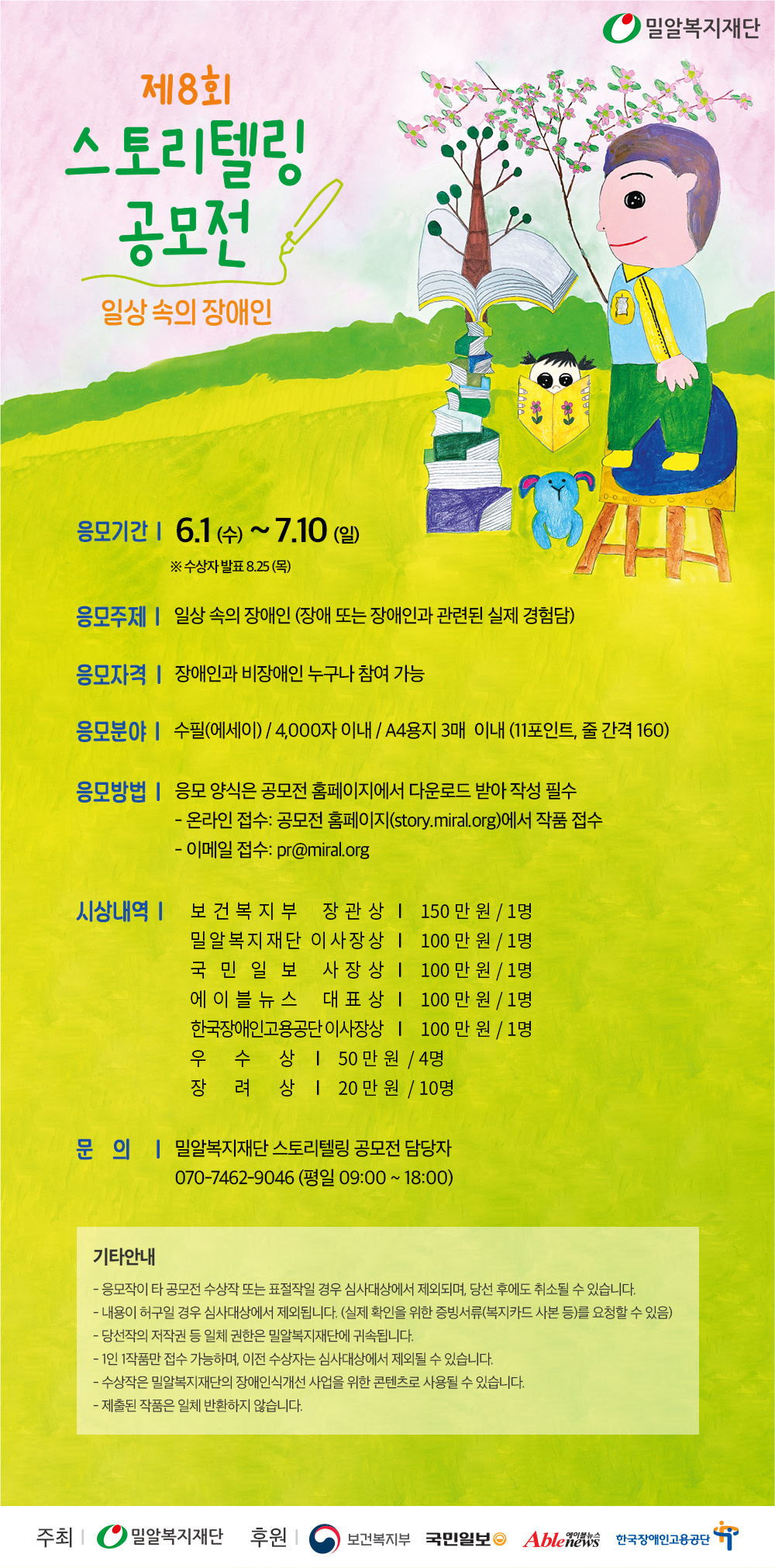 제8회 스토리텔링 공모전을 주최한 밀알복지재단은 1993년 ‘장애인의 완전한 사회통합’을 목표로 설립된 국내 대표 장애인 복지 전문기관으로, 장애아동의료비지원사업을 비롯해 장애인 특수학교, 장애인 직업재활시설, 장애인 공동생활시설 등 장애인의 생애주기별 맞춤형 복지사업을 운영하고 있다. (공모전 문의: 070-7462-9046)