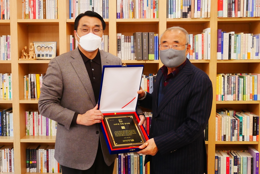 [사진2] (왼쪽부터) 밀알복지재단 홍정길 이사장이 송내사랑의교회 박명배 목사에게 감사패를 전달하고 있다.