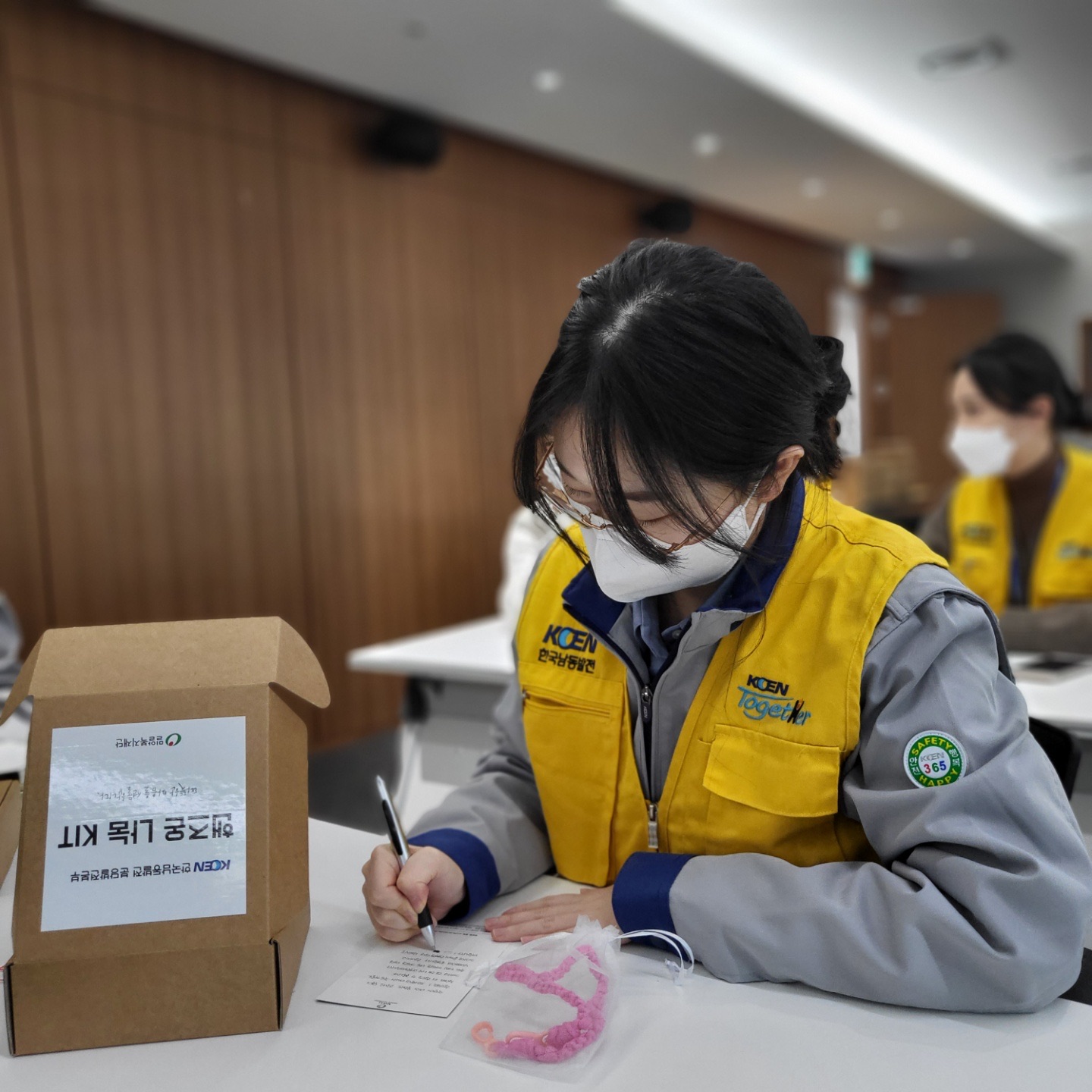 [사진1] 마스크 스트랩 만들기 후 엽서 작성중인 한국남동발전 분당발전본부 임직원