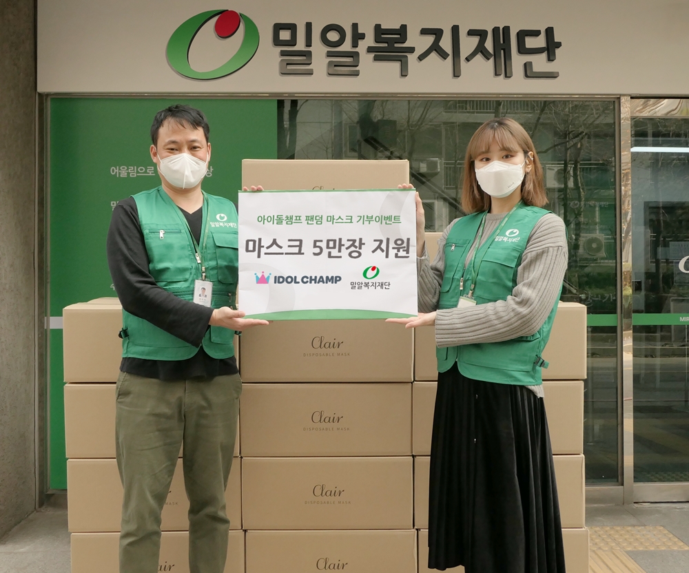 아이돌챔프는 지난 1월 19일부터 2월 말일까지 두 차례에 걸쳐 ‘마스크 기부 이벤트’를 실시하고, 목표 기부 모금액을 달성한 아이돌의 이름으로 밀알복지재단에 마스크 5만 장을 전달했다.