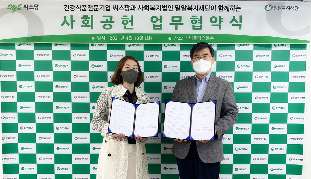밀알복지재단(이사장 홍정길)이 운영하는 기빙플러스는 ㈜씨스팡(대표 조정숙)과 13일(화) 소외이웃 자립과 건강증진을 위한 사회공헌 협약을 맺었다.