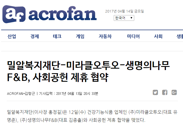 [아크로팬] 밀알복지재단-미라클오투오-생명의나무F&B, 사회공헌 제휴 협약