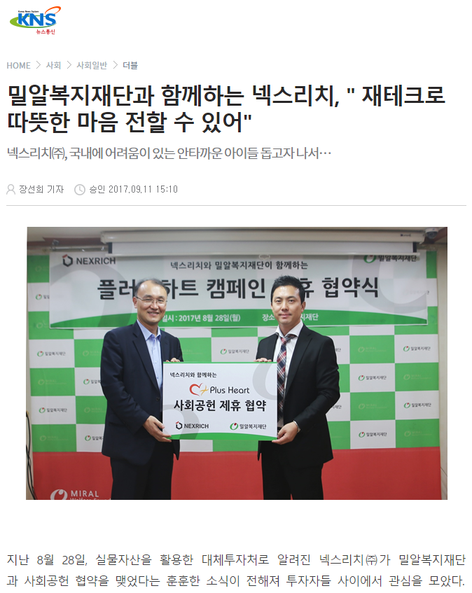 [KNS뉴스통신] 밀알복지재단과 함께하는 넥스리치, " 재테크로 따뜻한 마음 전할 수 있어"