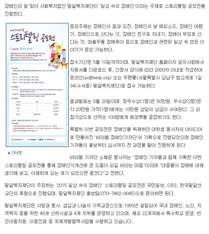 [빛가람뉴스] 밀알복지재단, 장애인의 달 맞아 장애와 관련된 스토리텔링 공모전 5월 10일까지 진행