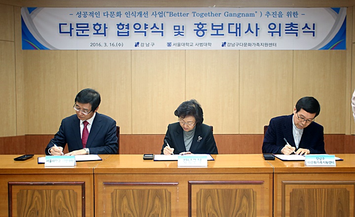 강남구청에서 진행된 이번 협약식에서는 신연희 강남구청장과 신민선 강남구다문화가족지원센터장, 서울대학교 김찬종 사범대학장을 비롯하여 성상환 교수, 윤여탁 교수, 박동열 교수 등이 참석하여 협약식을 진행하였습니다.