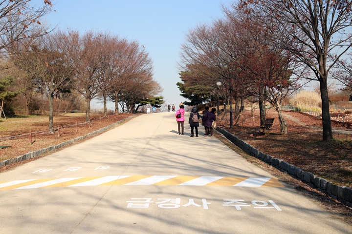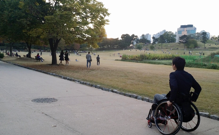 올림픽공원은 무려 43만 평이나 될 정도로 넓은 공터를 자랑한다. 공원의 모든 구역을 다니려면 하루 가지고는 부족할 정도. 넓은 길과 공터는 더할 나위 없지만, 경사와 포장 상태는 다소 들쭉날쭉한 편이었다. 어떤 곳은 선선한 바람을 즐기며 가볍게 휠체어를 끌 수 있지만, 동행자가 없으면 올라가기 힘든 곳도 있었다. 다행인 것은 경사가 심한 길이면 바닥에 ‘급경사 주의’라고 적혀있었다. 생각했던 것보다 길이 매끄러워서 탁 트인 공원 잔디밭과 하늘을 온몸으로 한 번쯤 느끼고 오길 권해 본다.
