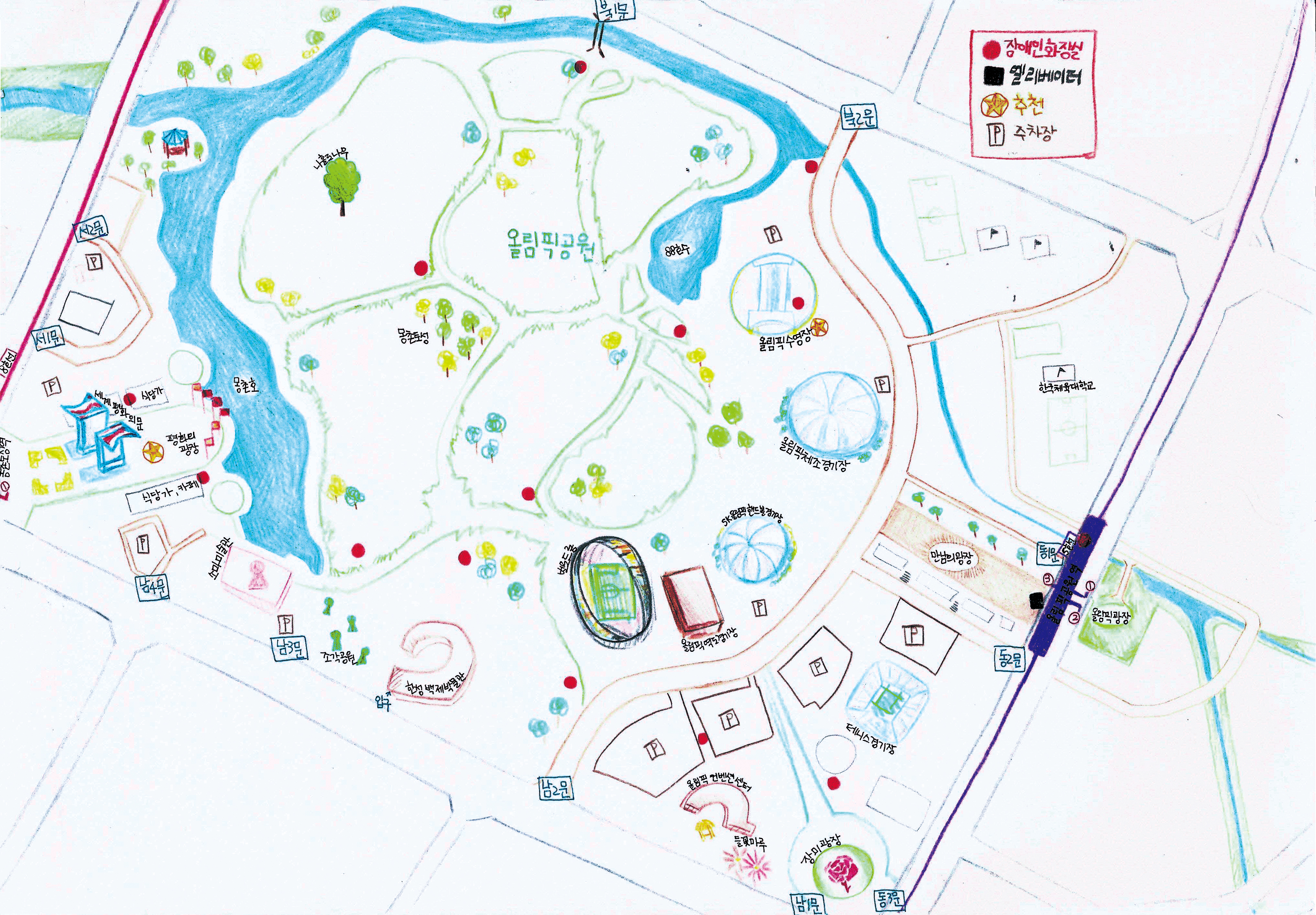 올림픽공원 주변엔 세 개의 역이 있다. ‘몽촌토성역’과 ‘올림픽공원역’, ‘방이역’이 바로 그것이다. 어느 곳으로 가든 올림픽공원에는 쉽게 다다를 수 있다. 다만 가장 가깝고, 주차가 편리해서 ‘올림픽공원역’에서 이동하길 추천한다. ‘몽촌토성역’에는 4번 출구, ‘올림픽공원역’은 3번 출구, ‘방이역’은 1번 출구, 3번 출구 2곳에 외부로 이동하는 엘리베이터가 있다. 세 역 모두 장애인화장실이 잘 구비되어 있었다. 지하철역뿐만 아니라 공원과 올림픽 경기장 내부 곳곳에 장애인화장실이 있어서 걱정 없이 산책을 떠나도 좋다. 단, 공원 내부에 매점은 부족한 편이니, 물은 꼭 챙겨가길 권장한다.