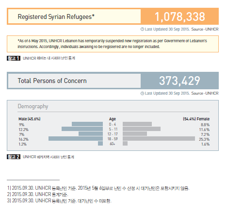 시리아 주요 인접국가인 터키, 레바논, 요르단, 이라크, 이집트에 수용된 시리아 난민은 400만 명에 육박한다. 시리아와 가장 인접한 레바논으로 피난 온 난민의 수는 약 120만 명에 육박하고 있다. 레바논의 인구가 450만 명이라는 점을 감안하면 막대한 숫자의 난민이 유입된 것이다.