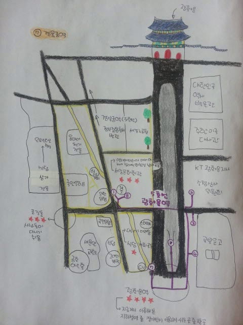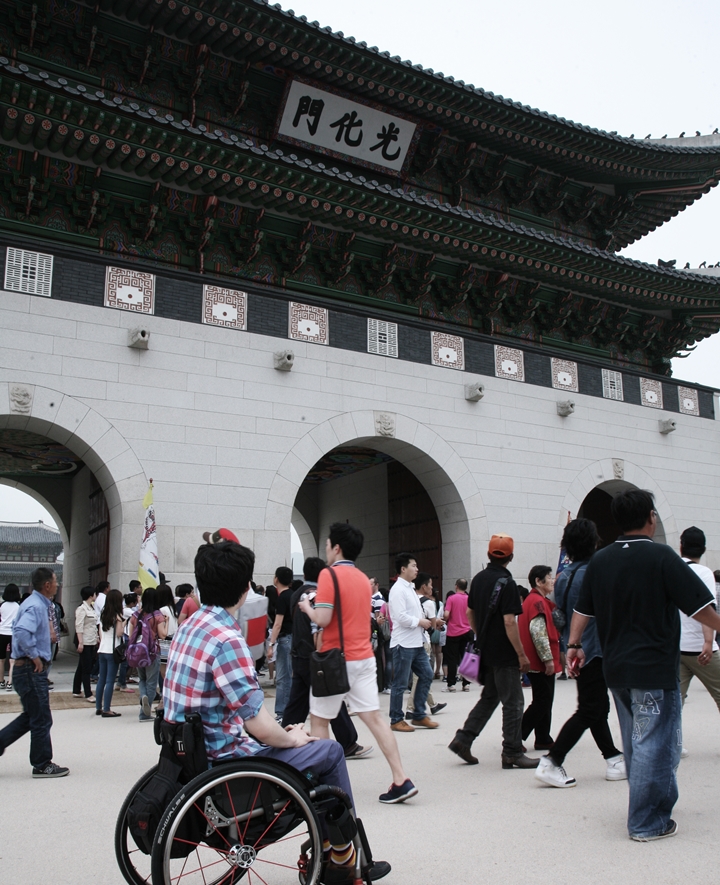 광화문은 경복궁의 정문이다. 성곽 문처럼 웅장한 위용으로 경복궁을 수호하고 있는 광화문은 1395년에 창건되어 ‘오문(午門), 정문(正門)’이라고 불리다가 세종 7년(1425년)에 집현전 학자들에 의해 ‘광화문(光化門)’이라는 이름을 얻게 되었다. ‘광화문’은 서경의 ‘광피사표 화급만방(光被四表 化及萬方)’이라는 구절에서 차용한 것인데, ‘나라의 덕치와 문화를 천하 만방에 미치는 문’이라는 뜻을 담고 있다. 광화문은 임진왜란 때 소실되었다가 흥선대원군에 의해 재건되었고, 한국전쟁 때 포탄을 맞아 훼손되었다가 광복 65주년이었던 2010년 8월 15일에 복원공사를 마쳤다. 광화문의 앞쪽에는 현대식 빌딩들과 넓은 도로가 펼쳐져 있고, 뒤쪽에는 경복궁과 전통양식의 건물들이 자리해 있어, 광화문은 마치 시대를 지키는 문처럼 보인다. 한국의 과거와 현재를 함께하는 광화문, 그 주변의 풍경들은 장애인과 함께하고 있을까? 특별한 지도그리기 서포터즈와 함께 광화문으로 향했다.