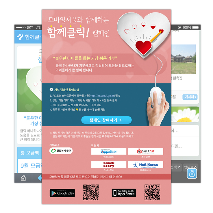 모바일서울과 함께하는 ‘함께클릭 기부 캠페인’을 통해 우리의 작은 실천 하나가 소외된 이웃들에게 큰 힘이 될 수 있음을 보여주는 소중한 기회가 되길 기대해봅니다.