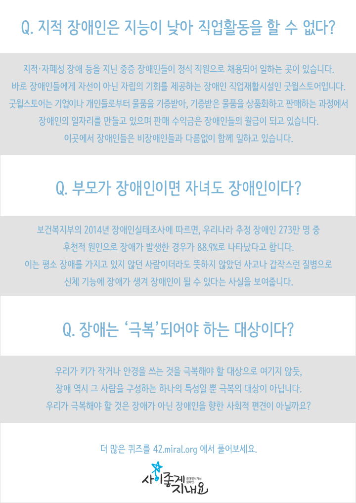 이 질문 중 몇 개를 맞추셨나요? 여러분은 장애인에 대해 어떻게 생각하고 계셨나요? 편견을 갖고 있진 않았었나요?